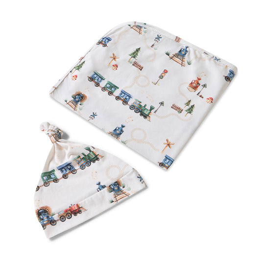 Trains Organic Jersey Wrap & Beanie Set
